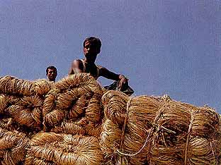ジュートとはインド周辺を原産とする一年草で、これを使ってロープやナンキン袋を作ったりする。又、カーペットの裏地や木の